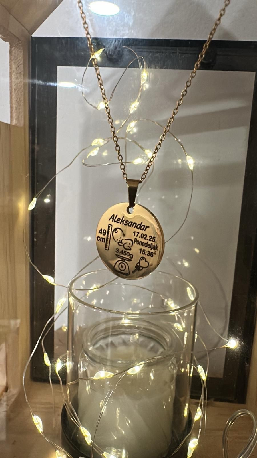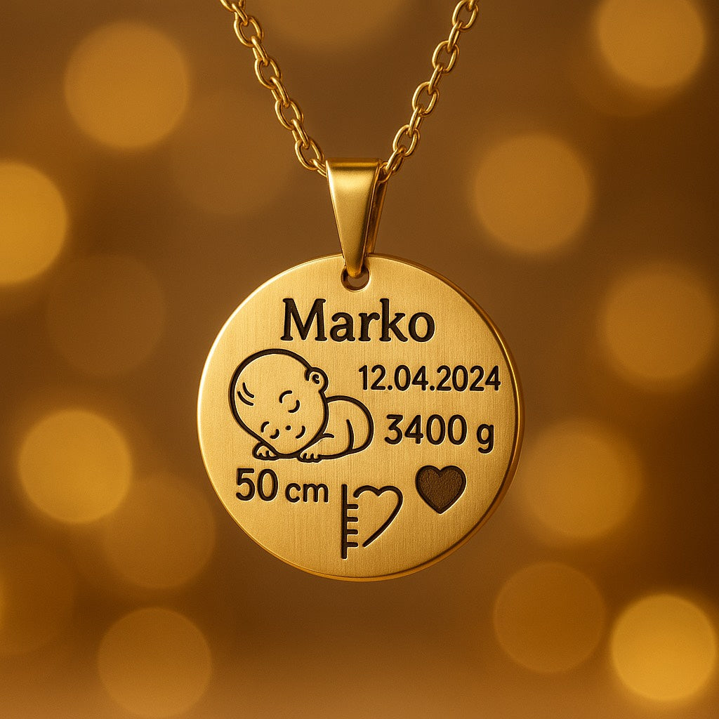 Naša personalizovana ogrlica “Moje Malo Čudo” čuva sve ono što srce pamti zauvek — ime, prezime, datum rođenja, vreme i grame kada se tvoja beba pojavila na svetu.